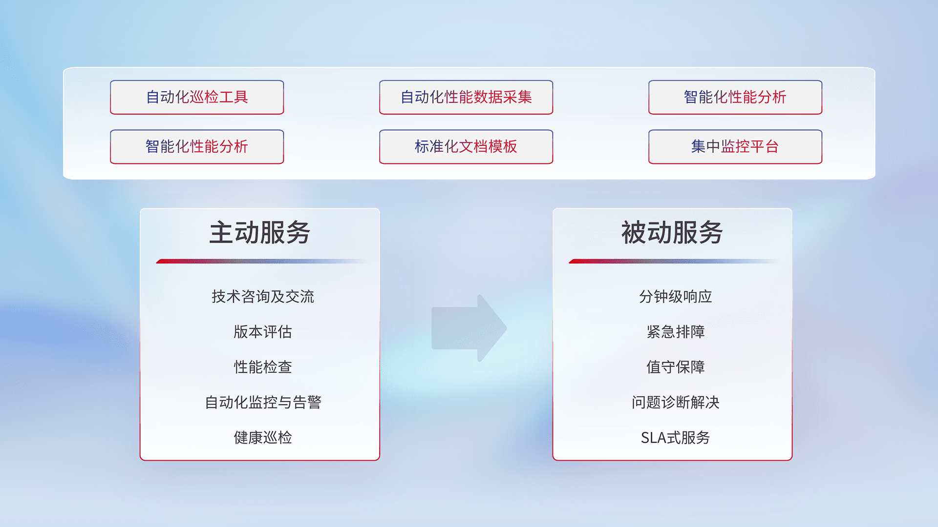 智能化工具和标准化文档,,,,保障服务质量,,,提供主动服务(包含技术咨询、、、版本评估、、、性能检查、、自动化监控与告警、、健康巡检)和被动服务包含(分钟级响应、、、紧急排障、、、值守保障、、、问题诊断解决、、SLA服务)。。